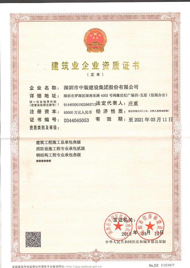 至此,中裝建設已經具有建筑裝飾專項工程設計甲級、建筑裝修裝飾工程專業承包壹級、建筑幕墻工程專業承包壹級、電子與智能化工程專業承包壹級、建筑機電安裝工程專業承包壹級、防水防腐保溫工程專業承包壹級、展覽陳列工程設計與施工一體化壹級資質、建筑工程施工總承包叁級資質等行業從業資質。